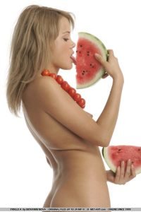 Sybille are ochi grozavi și o bărbie grozavă, creând o față grozavă din mai multe unghiuri. Giovanni_nova încearcă să încerce lucruri noi în studio. Împărtășirea scenei cu roșii și un pepene verde trebuie să fie greu. Sybille face o treabă excelentă în timp ce stă pe pepene sau ține felii de pepene sau face un colier de roșii. Fotografiile sunt foarte clare și minunate pentru a exploda și a privi tonurile pielii.