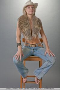 Lera emană un pui de cowgirl sexy, în timp ce ea pozează seducător în fața camerei în timp ce își scoate blugii din denim și blană faux, care își desfășoară corpul uimitor de atletic și membrele bine tonifiate.